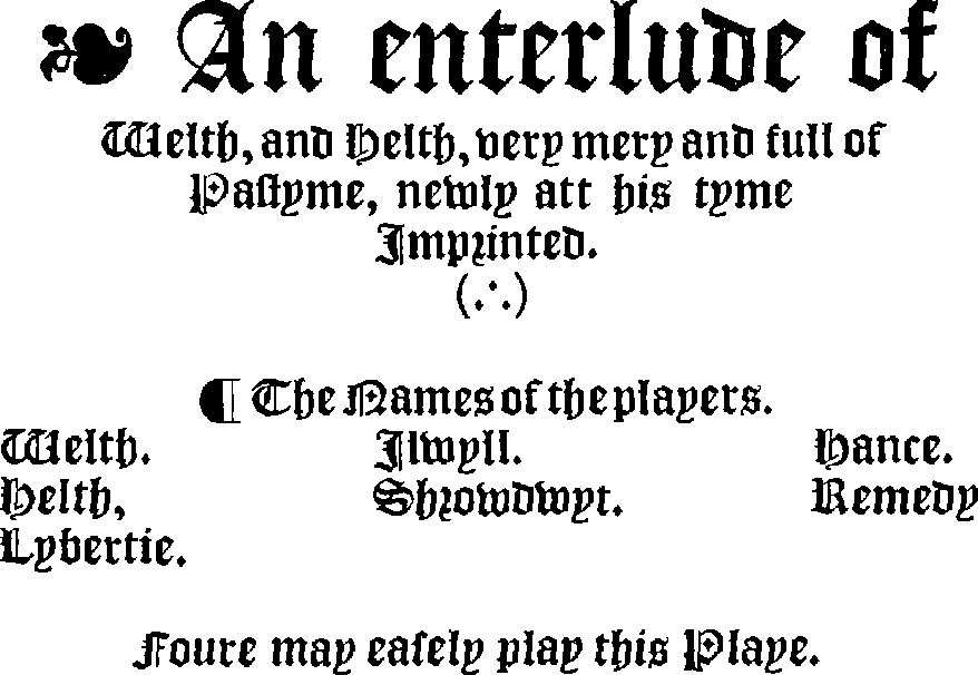 'Wealth and health' appears among the titles in the list of plays appended to the edition of Goffe's Careless Shepherdess, printed for Rogers and Ley in 1656. The entry was repeated with the designation 'C[omedy].' in Archer's list of the same year, and, without the addition, in those of Kirkman in 1661 and 1671. In 1691 Langbaine wrote 'Wealth and Health, a Play of which I can give no Account.' Gildon has no further information to offer, nor have any of his immediate followers. Chetwood, in 1752, classes it among 'Plays Wrote by Anonymous Authors in the 16th [by which he means the seventeenth] Century,' calls it 'an Interlude' and dates it 1602. This invention was only copied in those lists which depended directly on Chetwood's, such as the Playhouse Pocket-Companion of 1779. Meanwhile, in his Companion to the Play-House of 1764, D.E. Baker, relying upon Coxeter's notes, gave an essentially accurate description of the piece, except that he asserted it to be 'full of Sport and mery Pastyme,' and described it as an octavo. This entry has been copied by subsequent bibliographers, none of whom have seen the original.