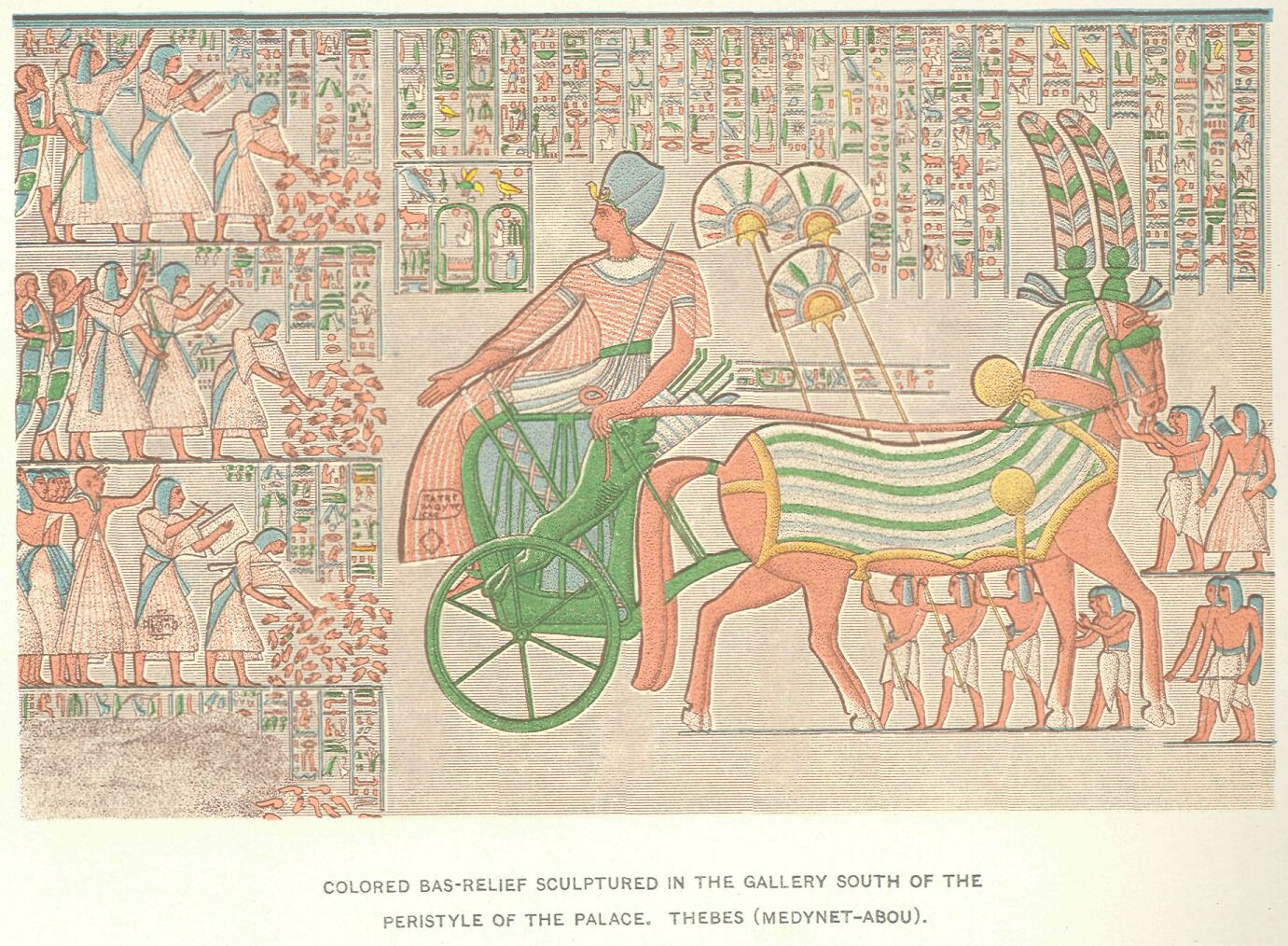 The farmer paid a small sum when entering into possession, and the remainder of the debt was gradually liquidated at the end of each twelve months, the payment being in silver one year, and in corn the two following. The rent varied according to the quality of the soil and the facilities which it afforded for cultivation: a field, for instance, of three bushels was made to pay nine hundred measures, while another of ten bushels had only eighteen hundred to pay. In many instances the peasant preferred to take the proprietor into partnership, the latter in such case providing all the expenses of cultivation, on the understanding that he should receive two-thirds of the gross product. The tenant was obliged to administer the estate as a careful householder during the term of his lease: he was to maintain the buildings and implements in good repair, to see that the hedges were kept up, to keep the shadufs in working order, and to secure the good condition of the watercourses. He had rarely enough slaves to manage the business with profit: those he had purchased were sufficient, with the aid of his wives and children, to carry on ordinary operations, but when any pressure arose, especially at harvest-time, he had to seek elsewhere the additional labourers he required. The temples were the chief sources for the supply of these. The majority of the supplementary labourers were free men, who were hired out by their family, or engaged themselves for a fixed term, during which they were subject to a sort of slavery, the conditions of which were determined by law. The workman renounced his liberty for fifteen days, or a month, or for a whole year; he disposed, so to speak, of a portion of his life to the provisional master of his choice, and if he did not enter upon his work at the day agreed upon, or if he showed himself inactive in the duties assigned to him, he was liable to severe punishment. He received in exchange for his labour his food, lodging, and clothing; and if an accident should occur to him during the term of his service, the law granted him an indemnity in proportion to the injury he had sustained.
