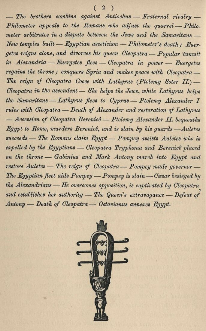Alexander the Great in Egypt—Alexandria founded—The Greeks favour the Jews—Ptolemy Soter establishes himself in Egypt and overcomes Perdiccas—Struggles for Syria—Beginning of Egyptian coinage—Art and Scholarship—Ptolemy resigns in favour of his son Philadelphus —First treaty with Rome—Building of the Pharos—Growth of Commerce—Encouragement of Learning—The library of Alexandria—Euclid the geometer—Poets, astronomers, historians, and critics—The Septuagint—Marriage of Philadelphus to his sister Arsinoë—Ptolemy Euergetes plunders Asia—Egyptian temples enlarged—Religious tolerance—Annual tribute of the Jews—Eratosthenes the astronomer—Philosophy and Science—Culmination of Ptolemaic rule—The dynasty declines under Philopator—Syrians invade Egypt; Philopator retaliates; visits Jerusalem—The Jews persecuted—The king’s follies—Riots at Alexandria—Inglorious end of Philopator—The young Ptolemy Epiphanes protected by Rome—Military revolt suppressed—Coronation of Epiphanes—The Rosetta Stone—Marriage of Epiphanes and Cleopatra, daughter of Antiochus the Cheat—A second rebellion repressed—Accession of Ptolemy Philometer under the guardianship of Cleopatra—Antiochus Epiphanes defeats Philometer—Euergetes seizes the throne and appeals to Rome—Antiochus supports Philometor against his brother Euergetes—The brothers combine against Antiochus—Fraternal rivalry—Philometer appeals to the Romans who adjust the quarrel—Philometer arbitrates in a dispute between the Jews and the Samaritans—New temples built—Egyptian asceticism—Philometer’s death; Euergetes reigns alone, and divorces his queen Cleopatra—Popular tumult in Alexandria—Euergetes flees—Cleopatra in power—Euergetes regains the throne; conquers Syria and makes peace with Cleopatra—The reign of Cleopatra Cocce with Lathyrus (Ptolemy Soter II.)—Cleopatra in the ascendent—She helps the Jews, while Lathyrus helps the Samaritans—Lathyrus flees to Cyprus—Ptolemy Alexander I rules with Cleopatra—Death of Alexander and restoration of Lathyrus—Accession of Cleopatra Berenicê—Ptolemy Alexander II. bequeaths Egypt to Rome, murders Berenicê, and is slain by his guards—Auletes succeeds—The Romans claim Egypt—Pompey assists Auletes who is expelled by the Egyptians—Cleopatra Tryphama and Berenicê placed on the throne—Grabinius and Mark Antony march into Egypt and restore Auletes—The reign of Cleopatra—Pompey made governor—The Egyptian fleet aids Pompey—Pompey is slain—Cæsar besieged by the Alexandrians—He overcomes opposition, is captivated by Cleopatra and establishes her authority—The Queen’s extravagance—Defeat of Antony—Death of Cleopatra—Octavianus annexes Egypt.
