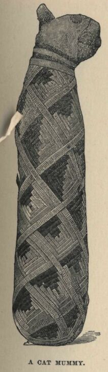 The cat was at all times one of the animals held most sacred by the Egyptians. In the earliest and latest times we find the statues of their goddesses with cats’ heads. The cats of Alexandria were looked upon as so many images of Neith or the Minerva of Saïs, a goddess worshipped both by Greeks and Egyptians; and it passed into a proverb with the Greeks, when they spoke of any two things being unlike, to say that they were as much like one another as a cat was to Minerva. It is to Alexandria also that we trace the story of a cat turned into a lady to please a prince who had fallen in love with it. The lady, however, when dressed in her bridal robes, could not help scampering about the room after a mouse seen upon the floor; and when Plutarch was in Egypt it had already become a proverb, that any one in too much finery was as awkward as a cat in a crocus-coloured robe.