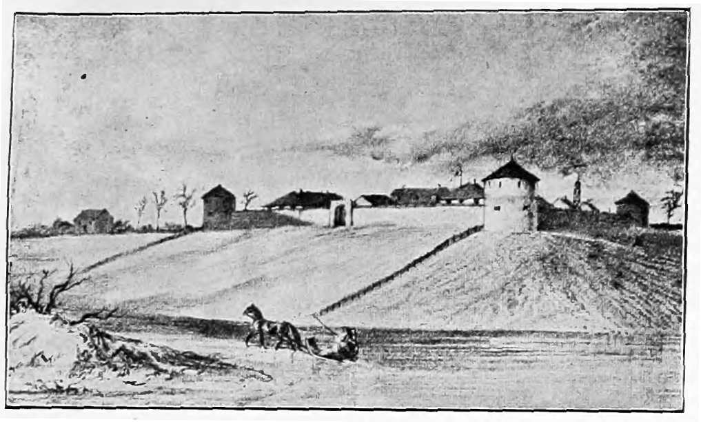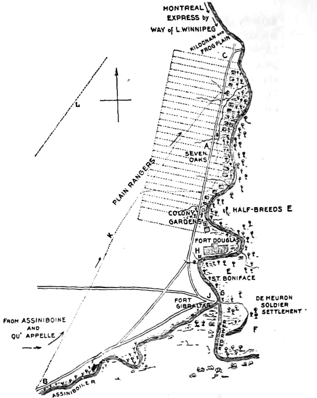 The last of the elements to come into the valley of the Red River and to precede the Colonists, was the Hudson's Bay Company—even then, dating back its history almost a century and a half. They were a dignified and wealthy Company, reaching back to the times of easy-going Charles II., who gave them their charter. For a hundred years they lived in self-confidence and prudence in their forts of Churchill and York, on the shore of Hudson Bay. They were even at times so inhospitable as to deal with the Indians through an open window of the fort. This was in striking contrast to the30 "Nor'-Wester" who trusted the Indians and lived among them with the freest intercourse. For the one hundred years spoken of, the Indians from the Red River Country, the Saskatchewan, the Red River and Lake Winnipeg, found their way by the water courses to the shores of the Hudson Bay. But the enterprise of the Montreal merchants in leaving their forts and trading in the open with the Indians, prevented the great fleets of canoes, from going down with their furs, as they had once done to Churchill and York. The English Company felt the necessity of starting into the interior, and so within six years of the time of the expedition of Thomas Curry, appeared five hundred miles inland from the Bay, and erected a fort—Fort Cumberland—a few hundred yards from the "Nor'-Westers'" Trading House, on the Saskatchewan River. By degrees before the end of the century almost every place of any importance, in the fur-producing country, saw the two rival forts built within a mile or two of each other. Shortly before the end of the 18th Century, the "Nor'-Westers" came into the Red River Valley and built one or two forts near the 49th parallel, N. lat.—the U.S. boundary of to-day. But four years after the new Century began, the "Nor'-Westers" decided to occupy the "Forks" of the Red and Assiniboine River, near where Verandrye's Fort Rouge had 31 been built some sixty years before. Evidently both companies felt the conflict to be on, in their efforts to cover all important parts, for they called this Trading House Fort Gibraltar, whose name has a decided ring of the war-like about it. It is not clear exactly where the Hudson's Bay post was built, but it is said to have rather faced the Assiniboine than the Red River, perhaps near where Notre Dame Avenue East, or the Hudson's Bay stores is to-day. It was probably built a few years after Fort Gibraltar, and was called "Fidler's Fort." By this time, however, the Hudson's Bay Company, working from their first post of Cumberland House, pushed on to the Rocky Mountains to engage in the Titanic struggle which they saw lay ahead of them. One of their most active agents, in occupying the Red River Valley, was the Englishman Peter Fidler, who was the surveyor of this district, the master of several forts, and a man who ended his eventful career by a will made—providing that all of his funds should be kept at interest until 1962, when they should be divided, as his last chimerical plan should direct. It thus came about that when the Colonists arrived there were two Traders' Houses, on the site of the City of Winnipeg of to-day, within a mile of one another, one representing a New World, and the other an Old World type of mercantile life. It was plain32 that on the Plains of Rupert's Land there would come a struggle for the possession of power, if not for very existence.33
