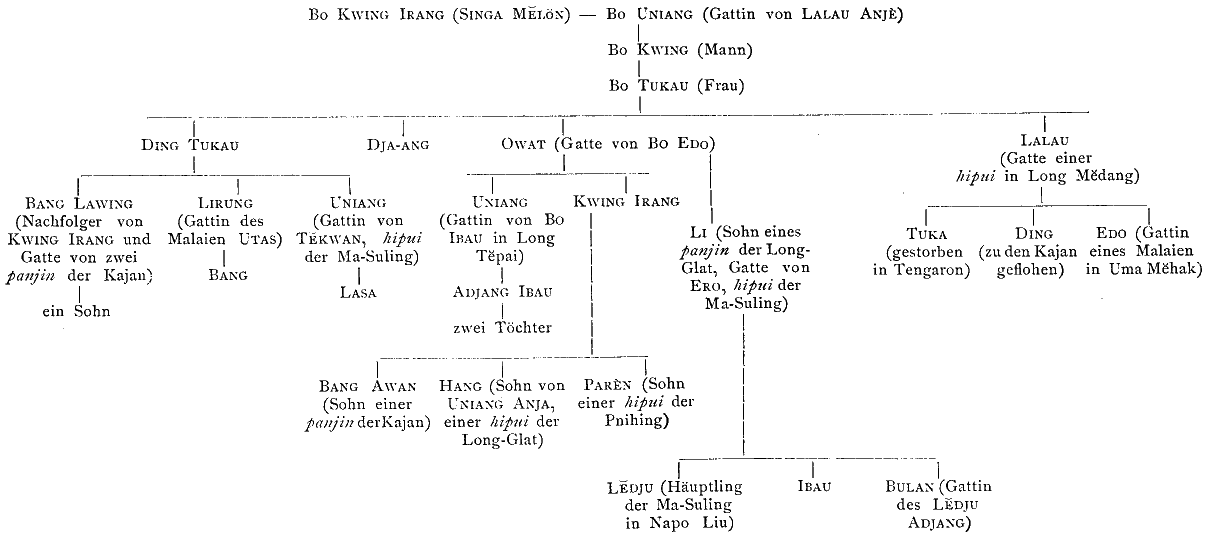 Wie ich mich bei Bo Adjāng überzeugen konnte, wird die Vielweiberei bei den Long-Glat-Häuptlingen unter malaiischem Einfluss in weit höherem Grade als oberhalb der Wasserfälle betrieben. Von Adjāngs zahlreichen Frauen lebten noch fünf, von denen zwei zur Arbeit bereits zu alt waren, drei aber alle Dienste verrichteten, die anderswo den Sklavinnen zufallen. Eine der Frauen war so jung, dass sie erst seit wenigen Jahren seine Gattin sein konnte. Ferner waren vier verheiratete Töchter anwesend, weil der Tod des kranken Vaters jeden Augenblick erwartet wurde.