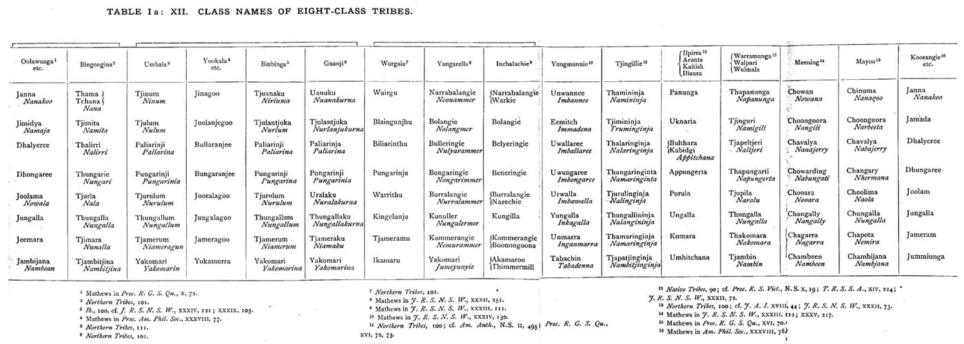 | Transcriber's Note | Table I a and the Arunta: Eight-class Table were printed on fold-out