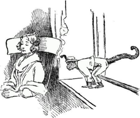 The brakeman and conductor came running in to see what was the matter. Nobody knew why the train had stopped. It was several minutes before they discovered the cause, but I had found out while Stuart was climbing back to bed with me. Swinging by her hands from the bell-rope which ran down the centre of the car, was that miserable little monkey, Matches, making a fool of herself and everybody else. Who but that little imp of mischief would have done such a thing as to get up in the middle of[Pg 15] the night and go through a lot of gymnastic exercises on the bell-rope? It was her swinging and jerking on the rope that rang the bell and brought the engine to that sudden stop.