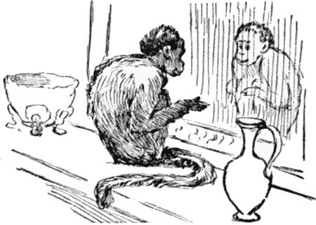 I have been wanting to get back into this room ever since that first morning that I slipped in and found you sitting here in the looking-glass, but the door has been shut every time that I have tried to come in. Do you remember that morning? You were the first ring-tail monkey that I had seen since I left the Zoo, and you looked so much like my twin brother, who used to swing with me in the tangled vines of my native forests, and pelt me with cocoanut-shells, and chatter to me all day long under those hot, bright skies, that I wanted to put my arms around you and hug you; but the looking-glass was between us. Some day I shall break that glass, and crawl back behind there with you.