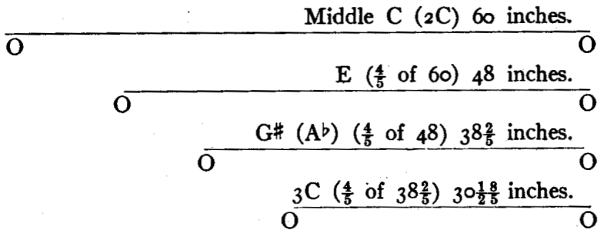 Begin with your lowest major third and strike each third in succession, ascending chromatically. Of course, each third should beat slightly faster than the one below it. For instance, in our system of two octaves, take 1C-E; this third should beat about 5 per second. Next, take 1C♯-F, which should beat about 5-1/2 per second. The beats should increase each test nearly a half beat, or the amount of 5 beats in this octave; hence, 2C-E will beat about 10 per second; or, using the exact figures, 10.16. After arriving at the last-named test, 2C-E, you may test the remainder of the two octaves by tenths, beginning with 1C-2E. The tenth is similar to the third mathematically, and its beats are even more distinct.
