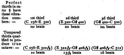 The intervals used are the minor and major third, perfect fourth and fifth, and major sixth. The thirds and sixths beat from about 7 to nearly 12 per second. The exact number of beats for each step in the system may be calculated from the "Table of Vibration Numbers" in Lesson XIII. For instance, take middle C (2C) at 256, and its major third, 2E. The exact third, determined by multiplying 256 by 5/4, is found to be 320. By reference to the table, we find the tempered third vibrates 322.54. The difference then is 2.54 vibrations per second, and, knowing that a difference of one vibration from the exact major third produces 4 beats, we simply multiply 2.54 by 4 and we have 10.16, the number of beats we should hear per second when this third is tempered correctly. Other intervals may be figured out in like manner by reference to the various tables given.
