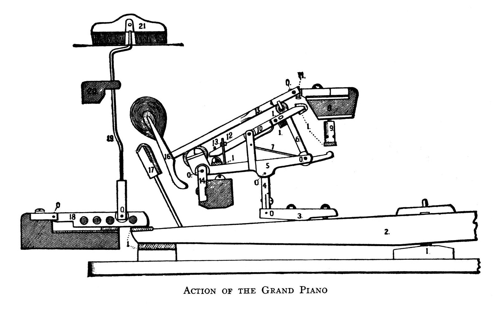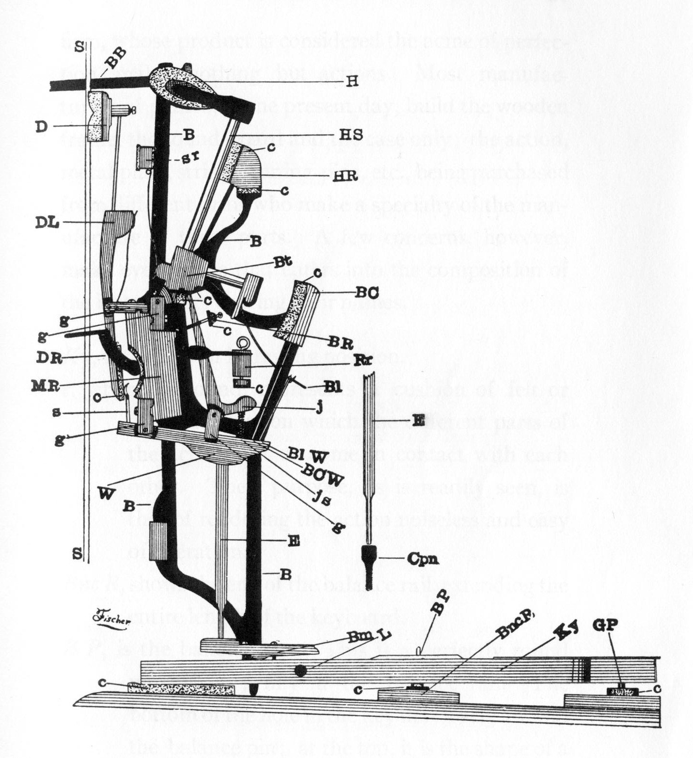 By this is meant the keys and all those intricate parts which convey the motion of the key to the hammers which strike the strings, and the dampers which mute them.