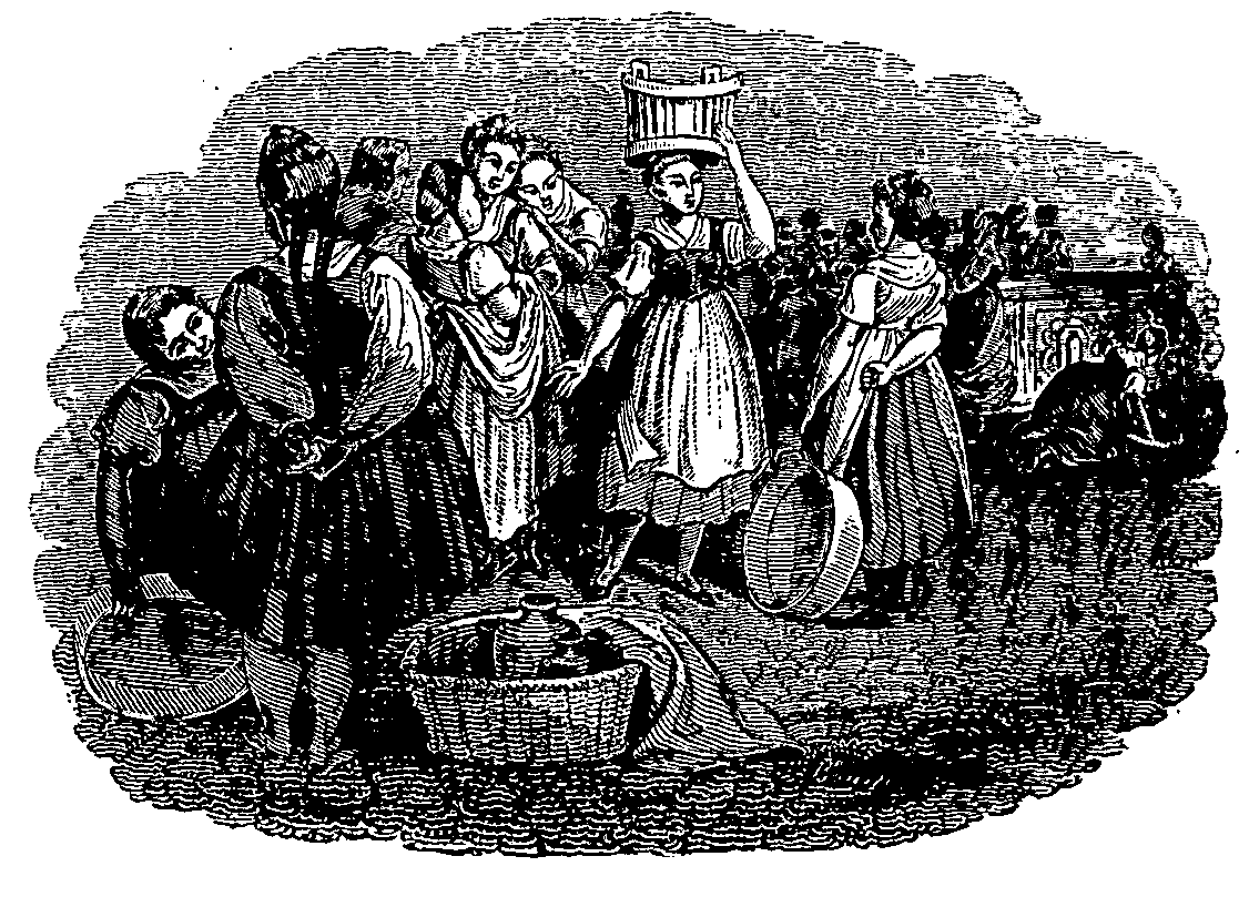 I have said something about the local of this Public Library, and of its being situated in the market-place.6 This market-place, or square, is in the centre of the town; and it is the only part, in the immediate vicinity of which the antiquarian's eye is cheered by a sight of the architecture of the sixteenth century. It is in this immediate vicinity, that the Hôtel de Ville is situated; a building, full of curious and interesting relics of sculpture in wood and stone. Just before it, is a fountain of black marble, where the women come to fetch water, and the cattle to drink. Walking in a straight line with the front of the public library (which is at right angles with the Hôtel de Ville) you gain the best view of this Hotel, in conjunction with the open space, or market place, and of the churches in the distance. About this spot, Mr. Lewis fixed himself, with his pencil and paper in hand, and produced a drawing from which I select the following felicitous portion.