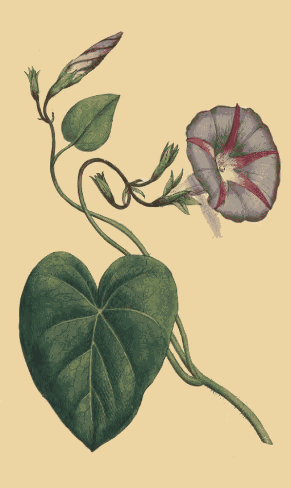 "Is an annual plant which grows naturally in Asia and America, but has been long cultivated for ornament in the English gardens, and is generally known by the title of Convolvulus major. Of this there are three or four lasting varieties; the most common hath a purple flower, but there is one with a white, another with a red, and one with a whitish-blue flower, which hath white seeds. All these varieties I have cultivated many years, without observing them to change. If the seeds of these sorts are sown in the spring, upon a warm border where the plants are designed to remain, they will require no other culture but to keep them clear from weeds, and place some tall stakes down by them, for their stalks to twine about, otherwise they will spread on the ground and make a bad appearance. These plants, if they are properly supported, will rise ten or twelve feet high in warm Summers: they flower in June, July, and August, and will continue till the frost kills them. Their seeds ripen in Autumn." Miller's Gard. Dict. ed. 4to. 1771.[Pg 13][Pg 12]