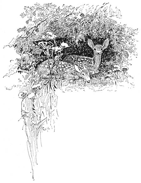 Eerst stilliggen en dan het witte vaantje volgen.—Toen ik ze weer zag, was de noodkreet der moeder niet meer noodig om hen aan die twee dingen te herinneren die elk hertje moet weten, als het groot wil worden in het uitgestrekte bosch. [36]