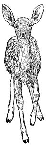 Mij hadden ze niet gezien, maar ze waren opgevlogen, toen een tak waarop ik stond uit te kijken naar mijn patrijzen onder mijn voeten bezweek, zoodat ik met groot gekraak onder den omgevallen boom terechtkwam. Toen ik daar op den uitkijk stond kon ik ze prachtig waarnemen, terwijl zelfs Kookooskoos mij nauwelijks ontdekt zou hebben; maar bij ’t eerste gekraak sprongen ze alle drie overeind, als duiveltjes in een doosje, wanneer ’t haakje los wordt gemaakt. De moeder stak haar witte vaantje in de lucht—den sneeuwwitten onderkant van haar nuttige staartje, die bij dag en bij nacht als een baken licht—en sprong [38]weg met een heesch ka-a-a-a-h! tot waarschuwing. Een van de kleintjes volgde dadelijk dapper in het voetspoor van de moeder, terwijl het met zijn eigen witte vaantje wuifde om den weg te wijzen aan al wat achter hem aan mocht komen. Maar het andere hertje ging er op staanden voet van door; stond echter al gauw weer stil om ons aan te staren en te roepen en met zijn teere pootjes te stampen, in een grappige mengeling van nieuwsgierigheid en uitdaging. Tot tweemaal toe moest de moeder in een kring terugkomen, eer hij haar eindelijk onwillig volgde. Elken keer als ze weer aan kwam sluipen kwispelde haar hangend staartje zenuwachtig—