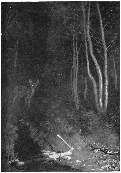 Ik bleef een poosje naar hem kijken, bekoord als ik zelf was door zoo iets moois: die sierlijke bewegingen, die zachte ooren met dat glanzende ovaal van helder licht er omheen, die oogen, gloeiend als tintelende regenbogen door het vlammende vuur ontstoken. Achter hem, in de verte, schalde de kreet van zijn moeder langs de helling, nu eens dichter bij, dan weer ver weg. Plotseling kwam er een wijziging, een andere klank in, alsof er gevaar dreigde, en weer hoorde ik dat roepen om te volgen, en ’t gekraak in het kreupelhout als ze wegsnelde. De lynx schoot mij weer te binnen en de korte, droevige geschiedenis die daar boven op den boomtronk geschreven stond. Ik schopte mijn vuur uit elkaar en stapte op het hertje toe—dat was de snelste manier om het dwaze, kleine ding te redden. Ja, toen al die pracht in duisternis [52]verdween en de reuk van een mensch hem op het koeltje dat uit het meer steeg in den neus kwam, ging de kleine baas er springend vandoor—helaas! recht het hertenpad op, denzelfden kant uit waar zijn moeder een oogenblik te voren was heengegaan.