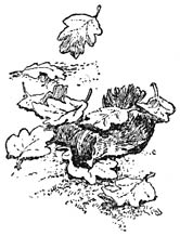 “Wat mooi!” riep ik uit, toen het licht op die bruine plek viel en er witte en gouden vlekken tooverde. De zonnestraal glipte weer weg, maar het was of hij zijn glans achterliet, want daar onder de wortels was de goudbruine plek nog en de vlekken van wit en geel. Ik bukte mij om beter te zien, stak mijn hand naar binnen—en de bruine vlek veranderde plotseling in een fluweelzacht vachtje; de witte, de gouden lichtglansen waren de geappelde flanken van twee hertjes, die daar doodstil en angstig bleven liggen op de plaats waar hun moeder hen bij ’t weggaan verstopt had.