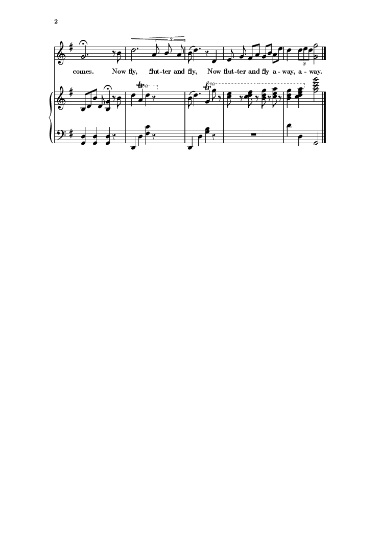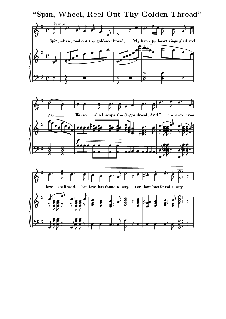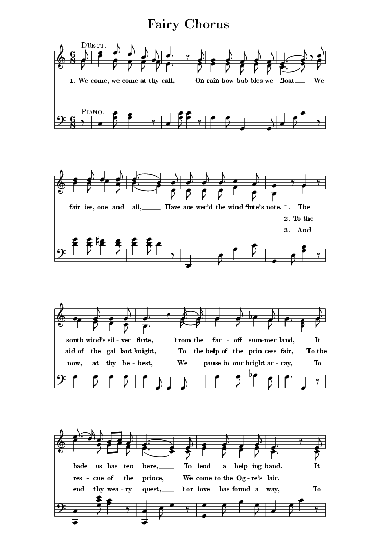 [Princess drops the ball, Knight catches it, and as Titania waves her wand, he starts along the line of Fairies. They each take hold as the Witch and Ogre come darting in, she brandishing her broomstick, he his bludgeon. They come through gate of the Orchard in the background. As the ball unwinds, the Fairies march around them, tangling them in the yards and yards of narrow yellow ribbon, singing as they go.