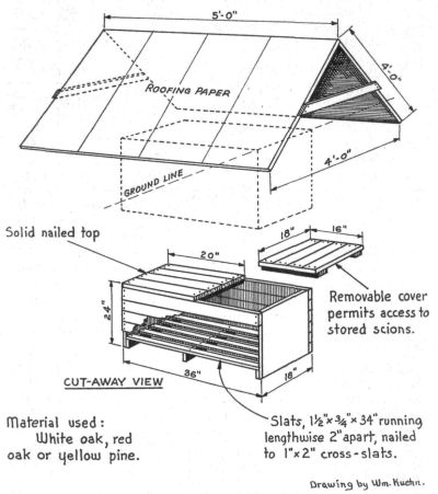 Scionwood may be cut the fall before grafting is to be done, after the growing season has ended, but some prefer to cut the scions in early spring. This means that the scions must be stored until time to graft, and correct storage is so important that nurserymen make elaborate provision for it. I have found that keeping scions underground in a Harrington graft storage box is the safest method. An illustration of this box is given, with directions for its construction and location. A small quantity of scions may be kept in an icebox (not a mechanical refrigerator), by cutting them into convenient lengths of one or two feet, dipping them in melted beeswax, wrapping them in tar or asphalt paper and placing them close to the ice. They will remain in good condition for several months if there is always a good supply of ice. Care must be taken in dipping the scions in melted wax, for if the wax is too hot it will injure the buds. It should never become so hot that it smokes. I find it advisable to keep an unmelted piece of wax in the liquid wax to hold the temperature down.