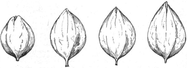 I also liked to pick hazelnuts when I was a boy. These are probably the least interesting among the wild nuts since they are usually small and hard to crack. There is much variation in wild hazels, however, and many people may recall them as being reasonably large. One of the two species abundant in Minnesota, Corylus cornuta or Beak hazel, has fine, needle-like hairs on its husk which are sure to stick into one's fingers disagreeably. When the husk is removed, Corylus cornuta resembles a small acorn. It does not produce in southern Minnesota and central Wisconsin as well as the common hazel, Corylus Americana, does, nor is its flavor as pleasing to most people. It is lighter in color than the common hazel and has a thinner shell. Of course, some[Pg 5] hazels are intermediate or natural hybrids between these two species, and if the nuts of such hybrids are planted, they generally revert to one of the parents when mature enough to bear. This natural hybridization occurs among all plants, between those of the same species, the same genera or the same family. It is very rare between plants of different families. The process is a very important one in horticulture and I shall explain some of the crosses which are well-known later in this book.[Pg 6]