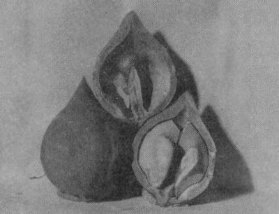 An instance in which the nuts themselves were useless for purposes of identification occurred when I sent some black walnuts to the Division of Pomology at Washington, D. C. These were the Ohio variety which I had grafted on butternut roots. The tree had been bearing for three or four years but this was the first year the nuts had matured. During their bearing period, these black walnuts had gradually changed in appearance, becoming elongated and very deeply and sharply corrugated like butternuts although they still retained the black walnut flavor. Because of this mixture of characteristics, the government experts had great difficulty in identifying the variety, although the Ohio was well known to them.