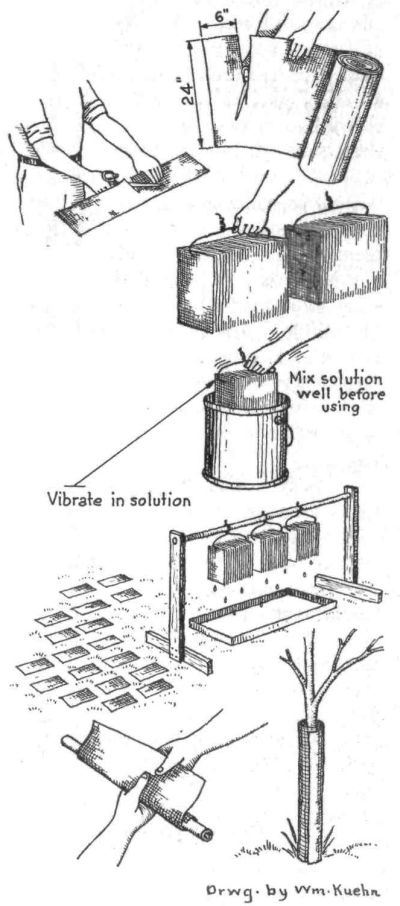 At my nursery, we make our own tape. We buy pure rubber gum, known as Lotol NC-356, from the Naugatuck Chemical Company, at a cost of $7.50 for five gallons, F.O.B. their factory. With this, we use unbleached muslin of an 80 x 80 mesh, or finer. As the muslin is usually a yard wide, we fold it and take it to a printing firm, where, for a small charge, it is cut into both one-half and three-quarter inch strips by being fed through a paper-cutting machine. We use the wider strips for heavy work on large trees which have three to five-inch stubs; the narrower strips we use in the nursery, grafting young seedlings.