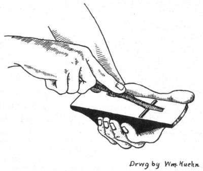 In grafting young nursery trees not more than an inch in diameter, the whole tree is cut off at any distance from the ground convenient to the nurseryman. Sometimes they are cut within a few inches of the ground, sometimes two or three feet. In my work, I like to keep the scions as high above the ground as I can. When the top of a stock is cut off, there is a great deal of sap pressure and the tree bleeds. It is a poor policy to attempt grafting while this is happening. Rather, one should cut the tops off, then wait for several days before inserting any grafts. Tools must be kept very sharp. A good grafting knife is sharpened on one side only, so that the blade is flat along the side which lies next to the cut made on the scion when it is trimmed. If unaccustomed to handling a knife, one can obtain more accurate results by using a small plane. I do this by holding the scion firmly in my right hand and pulling it toward me, against the cutting edge of the plane which is held in the left hand. Illustrations show how this is done.
