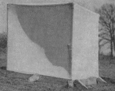 8 x 8 x 8 foot tightly woven sheet of unbleached muslin stretched over mother hazel plant during pollination period in the process of making controlled crosses between it and filbert parents. Photo by C. Weschcke.