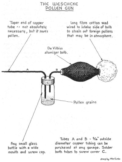 When hybridizing walnuts, it is necessary to use a pollen gun instead of removing the bag from around the female blossoms and applying the pollen with a cotton-covered applicator. Such a pollen gun can be made by using a glass vial which does not hold more than an ounce of liquid. An atomizer bulb, attached to a short copper or brass tube soldered into a metal screw-cap, is fitted to the vial. Another small copper or brass tube should also be inserted in the screw-cap close to the first one. The second tube should be bent to a right angle above the stopper and its projecting end filed to a sharp point. Without removing the bag from around the pistillate blossoms, the hybridizer forces the point of the atomizer through the cotton wadding between bag and branch. The pollen in the vial is blown through the tube into the bag in a cloud, covering all the enclosed blossoms. It is advisable to repeat this on several successive days to make certain of reaching the female blossoms during their most receptive period.