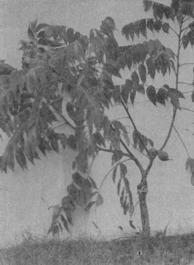 In the spring of 1937, these native seedlings were again offered to the spirit of propagation, when a large part of the scionwood of English walnuts I had imported from the Carpathian mountains of Poland was grafted on them. The success of my grafting in this instance was only about 1-1/2%, showing that something was decidedly wrong. Two conclusions were possible: Either the scionwood had been injured by transportation and the severe winter temperatures during January and February of 1937 during which they were stored, or incompatibility existed between the imported walnuts and our local ones. My conclusion now is that when these stocks are fifteen years old or more and are thrifty, they will support grafting of the Carpathian English walnuts much more successfully than they will in their first decade of growth. Results have shown that these local stocks will accept such grafts, however, and that crops of English walnuts will be produced. The fertility of the soil must be maintained carefully, since the English walnut top tends to overgrow its black walnut root-stock, and unless nutritional substance for the support of these tops is fed to the root-system, meager crops, if any, will result.
