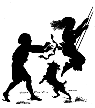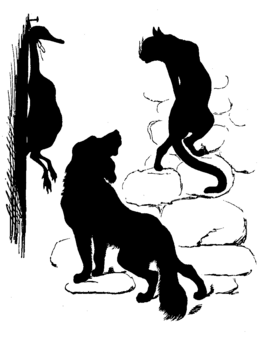 Now, Nep was a very funny dog—a nervous dog, Uncle Hugh called him—and he was quite afraid something would happen. By and by, poor pussy came to have a peep at the goosey-gander, and she [Pg 17]climbed up the steps on tip-toe just to look. Nep watched her, and didn't feel easy in his mind, and when poor pussy just stretched forward her head (because she was a little short-sighted, I dare say), Nep could bear it no longer. He gave a great loud bark, and flew along the road after the wretched, flying cat. Silly dog! while he was gone after puss, and just as he had his fore-paws quite over her back, up comes a sly thief to the hut door, quietly unhooks the bird, and runs off the other way, with its head hanging over his shoulder. "And, so, you see, Sissy," said[Pg 18] Uncle Hugh in his funnily grave way, "poor Jack and I came back to find our dinner all gone!" But they got scent of the thief, and they caught him and shut him up in their little hut, and locked him in, and left him with nothing but bread and water. "For there was no policeman there, Sissy; we had to play policemen ourselves."