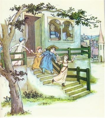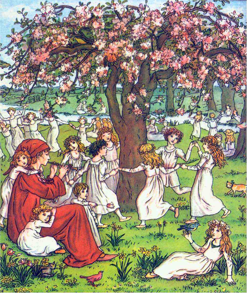 The Mayor was dumb, and the Council stood As if they were changed into blocks of wood, Unable to move a step, or cry To the children merrily skipping by. [Pg 43]—Could only follow with the eye That joyous crowd at the Piper's back. But how the Mayor was on the rack, And the wretched Council's bosoms beat, As the Piper turned from the High Street To where the Weser rolled its waters Right in the way of their sons and daughters! However he turned from South to West, And to Koppelberg Hill his steps addressed, And after him the children pressed; Great was the joy in every breast. "He never can cross that mighty top! He's forced to let the piping drop, And we shall see our children stop!" When, lo, as they reached the mountain-side, A wondrous portal opened wide, As if a cavern was suddenly hollowed; And the Piper advanced and the children followed, And when all were in to the very last, The door in the mountain side shut fast. Did I say, all? No; One was lame, And could not dance the whole of the way; And in after years, if you would blame His sadness, he was used to say,— "It's dull in our town since my playmates left! I can't forget that I'm bereft Of all the pleasant sights they see, Which the Piper also promised me. For he led us, he said, to a joyous land, Joining the town and just at hand,