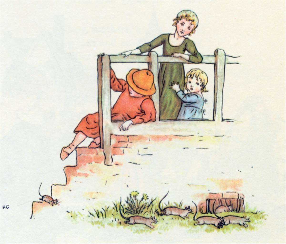 And the muttering grew to a grumbling; And the grumbling grew to a mighty rumbling; And out of the houses the rats came tumbling. Great rats, small rats, lean rats, brawny rats, Brown rats, black rats, grey rats, tawny rats, Grave old plodders, gay young friskers, [Pg 19]Fathers, mothers, uncles, cousins, Cocking tails and pricking whiskers, Families by tens and dozens, Brothers, sisters, husbands, wives— Followed the Piper for their lives. From street to street he piped advancing, And step for step they followed dancing, Until they came to the river Weser Wherein all plunged and perished! —Save one who, stout as Julius Cæsar, Swam across and lived to carry (As he, the manuscript he cherished) To Rat-land home his commentary: Which was, "At the first shrill notes of the pipe, I heard a sound as of scraping tripe, And putting apples, wondrous ripe, Into a cider-press's gripe: And a moving away of pickle-tub-boards, And a leaving ajar of conserve-cupboards, And a drawing the corks of train-oil-flasks, And a breaking the hoops of butter-casks: And it seemed as if a voice (Sweeter far than by harp or by psaltery Is breathed) called out, 'Oh rats, rejoice! The world is grown to one vast drysaltery! So munch on, crunch on, take your nuncheon, Breakfast, supper, dinner, luncheon!' And just as a bulky sugar-puncheon, All ready staved, like a great sun shone Glorious scarce an inch before me, Just as methought it said, 'Come, bore me!' —I found the Weser rolling o'er me."