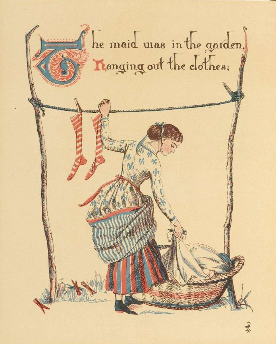 Whether the Poet undertook to write and SING A SONG OF SIXPENCE for that popular price is not stated in his simple rhyme, but, at all events, we learn that he started with "a pocket full," and proceeded to draw on his imagination for all it was worth. What that famous blackbird-pie really cost—except in black-birds—is not disclosed, though the King seemed to show some anxiety about the state of his treasury, as he was discovered "in his counting house" imediately after the feast. But while the Queen, regardless of expense, regales herself on "bread and honey" in "the parlour", and her Maid-of-honour, or perhaps of-all-work, is engaged at the clothes-line, nothing is said about a princess.