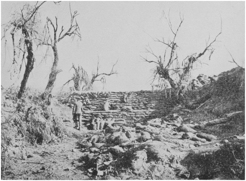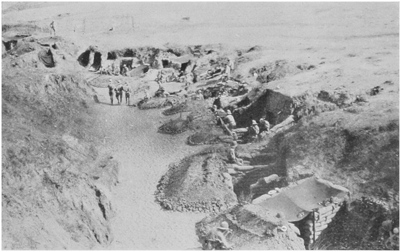 In these surroundings we spent about a week before getting a turn in the front line. We struck a reasonably quiet sector and fairly well dug, but there were several details in which the trenches varied from what we were accustomed to read about. The first and most noticeable difference from the point of view of the inhabitants was the entire absence of head cover. Even after we had been on the Peninsula nearly three months all we had collected were one or two poles, a sheet of corrugated iron (ear-marked as a roof for a signal station), and a few yards of wire-netting. There was not a house or a building of course in the country-side, and as our neighbours were as badly off as we were, there was no scope for the enterprising.