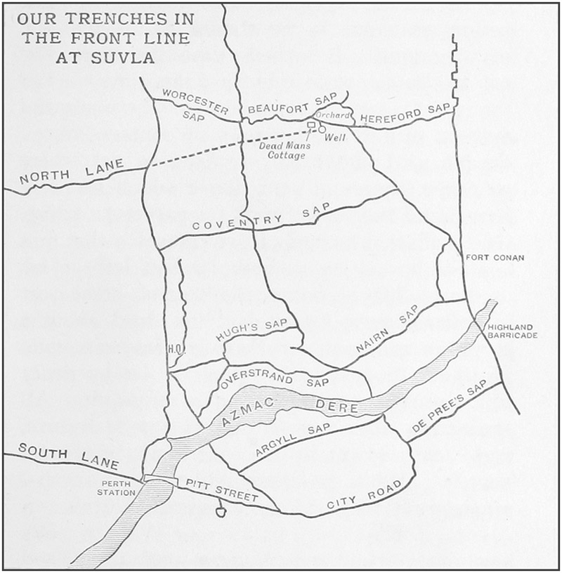 As regards the lie of the land and our positions there—coming up from the beach at Suvla there were fully two miles of flat country before you reached the foothills. The northern part of this plain was a shallow lake dry in [17]summer but with a few feet of brackish water in winter called Salt Lake, and the southern part a few feet higher stretched down to “Anzac,” where spurs running down from Sari Bahr to the sea terminate it abruptly. Our front line, generally speaking, was just off the plain, a few hundred yards up the slopes of the foothills, with any reserves there were lying in trenches on the plain.