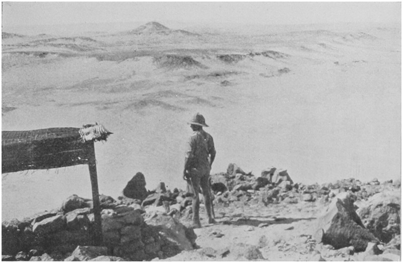 Imagining the whole Suvla plain and its surrounding hills to be a horse-shoe, you might say the Turks held round three parts of the shoe, leaving us with the two heels at Caracol Dagh on the north and Anzac on the south, and a line between these two points across the plain. This plain was practically bare, but Caracol Dagh was thickly covered with dwarf oak and scrub, and Anzac with a good undergrowth of rhododendron, veronica, and other similar bushes. At Sulajik (the centre of the horse-shoe), and immediately to the north of it, and also round the villages in the Turkish lines, were numbers of fine trees, but nowhere that we could see was there anything that could be called a wood. As regards the soil, the gullies at Anzac on the spurs of Sari Bahr were quite bewildering in their heaped up confusion, partly rocky, but mainly a sort of red clay and very steep. In the centre it was a yellower clay with patches of sand and bog, and on Caracol Dagh it was all rock and stones, so that digging was [18]impossible, and all defences were built either with stones or sandbags. The view looking back to the sea from almost any part of our line was glorious. Hospital ships and men-of-war, and generally monitors and troop-ships in the Bay, and on the horizon the peaks of Imbros and Samothrace reflecting the glorious sunrises and sunsets of the Levant.