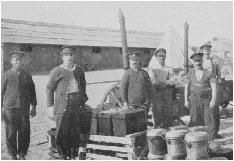 Here our difficulties began with daylight, as we were in full view of the Turkish positions and within easy range of their guns, with the result we were not allowed to move about outside the trenches during the day. Water had to be fetched by hand about a mile and then had to be boiled, and we had not, like those who had been on the Peninsula a few weeks, collected a stock of petrol and biscuit tins for storage. Later on we even got water-carts filled with water brought from Mudros or Egypt, but not for at least six weeks, and meantime everything had to be carried and stored in petrol tins, rum jars, and such few biscuit tins as were water-tight. The wells were so congested, and the water so scarce that water-bottles were not allowed at the wells, and all we could do was to keep them in the cookhouse, ready to be filled and issued as the water was boiled. Apart from the November blizzard our first week in the reserve trenches, until we got our water supply in working order, was the most uncomfortable of our stay. Rations were really wonderfully plentiful and good.