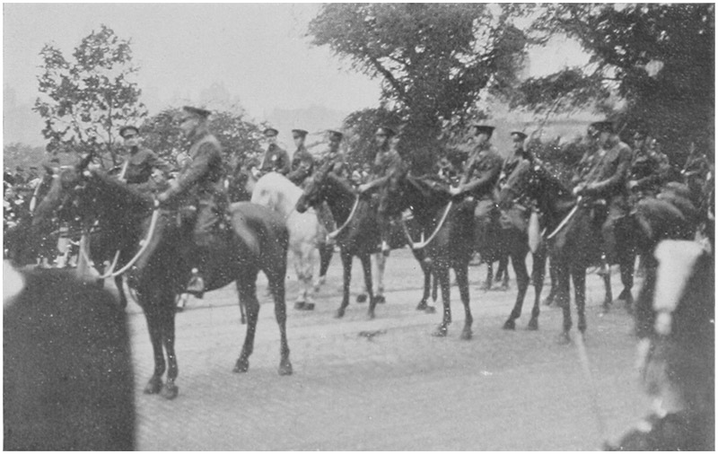 [2]The headquarters of the Regiment was at Kirkcaldy, the four Squadrons A, B, C, and D having their headquarters respectively at Cupar, Dunfermline, Dundee, and Forfar. The recruiting area comprised the counties of Fife, Forfar, Kinross, and Clackmannan, and there was also a troop in Stirlingshire within a few miles of Loch Lomond. The rest of the Highland Mounted Brigade, to which the Regiment belonged, was pure Highland, consisting of two regiments of Lovat’s Scouts, the Inverness Battery, R.H.A., and a T. and S. Column and Field Ambulance hailing also from Inverness. On changing to War Establishment, D Squadron dropped out and was divided amongst A, B, and C, with the exception of Lieut.-Colonel King who went to Remounts, and Captain Jackson who became Staff Captain on the newly formed Brigade Staff.