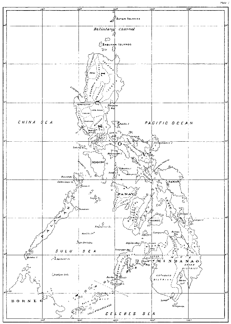 As we would hardly be justified in assuming that every reader is in possession of a detailed map of the Philippines, and a knowledge of the general distribution and the main directions of the principal mountain systems of an earthquake country is important, we add a second map on which these data are shown by means of dashes, together with the most important seismic regions, and the positions of the principal towns, bays, etc., mentioned in the text. (Plate II.)