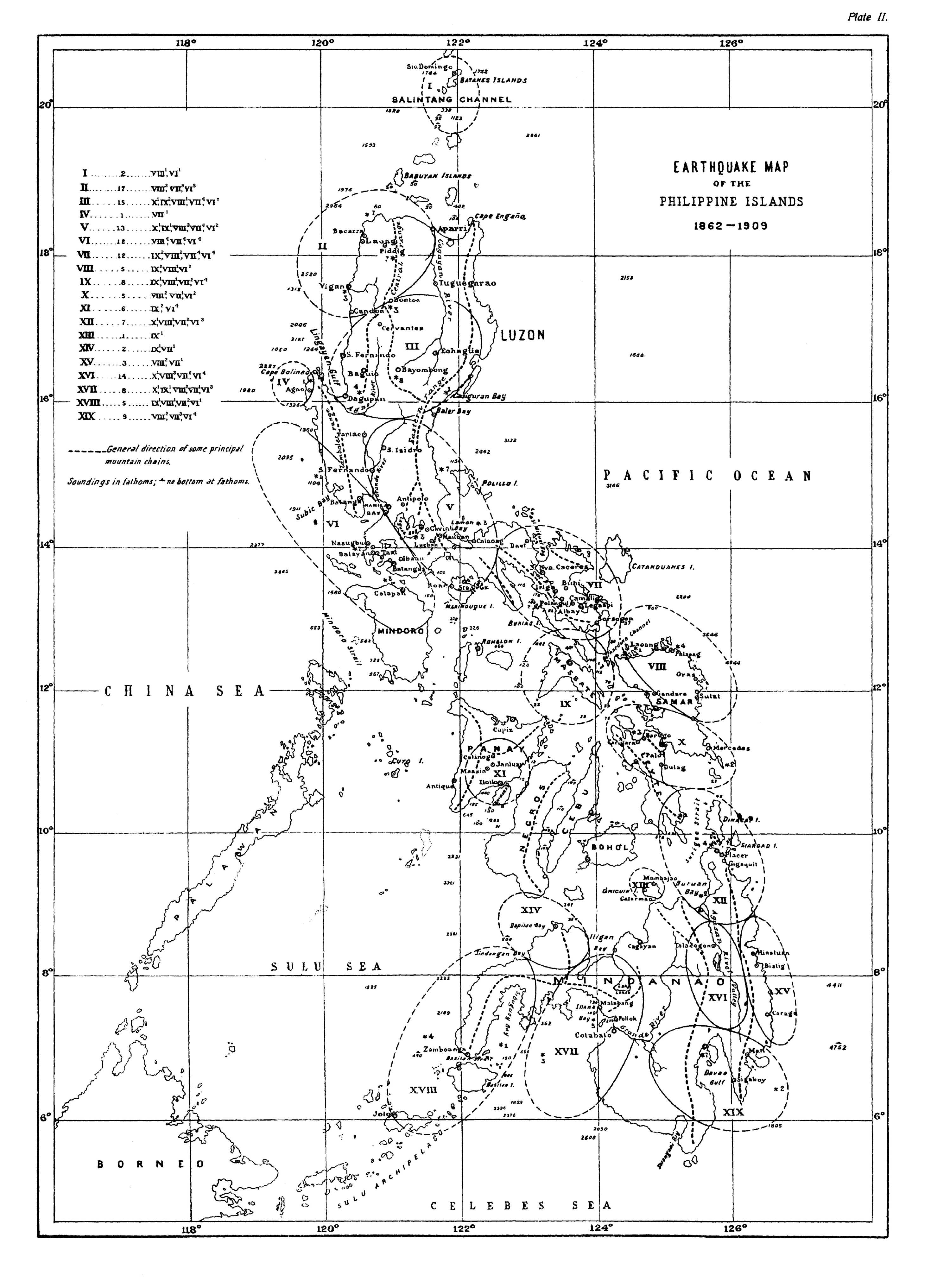 Introduction.—The occasion for publishing this catalogue of Philippine earthquakes which were of violent and destructive character has been furnished by a request from Prof. John Milne for a list of such phenomena, to be included in the General Earthquake Catalogue which this eminent seismologist is preparing under the auspices of the British Association for the Advancement of Science. The said general catalogue has been undertaken with a view toward reducing to uniformity and completing those published years ago by Robert Mallet (1859) and Perrey (1844-1871). The form adopted for Professor Milne's new catalogue is very concise, comprising only the date, intensity, and region together with principal localities affected. It will contain only the earthquakes of intensities VII to X according to the scale of De Rossi-Forel, and these will be divided into three classes: Class I will be formed by the earthquakes of sufficient force to produce cracks in buildings and to throw down chimneys; they correspond to force VII of De Rossi-Forel. Class II consists of the earthquakes which not only threw down chimneys but also walls and some weak structures; force VIII of De Rossi-Forel. Class III comprises the earthquakes which caused general destruction; force IX and X of De Rossi-Forel. As this classification is as purely conventional as every other and adopted only in the catalogue mentioned, we do not employ it in the present catalogue of Philippine earthquakes, but retain the almost universally adopted scale of De Rossi-Forel. We shall also present more details as to the towns and buildings damaged, the number of victims and other disastrous effects than enter into the catalogue of Professor Milne.