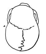The typical Eskimo skull, according to popular notion, is one exhibiting a low order of intelligence, and characterized by small brain capacity, with great prominence of the [Pg 41]superciliary ridges, occipital protuberance and zygomatic arches, the latter projecting beyond the general contour of the skull like the handles of a jar or a peach basket; and lines drawn from the most projecting part of the arches and touching the sides of the frontal bone are supposed to meet over the forehead, forming a triangle, for which reason the skull is known as pyramidal.