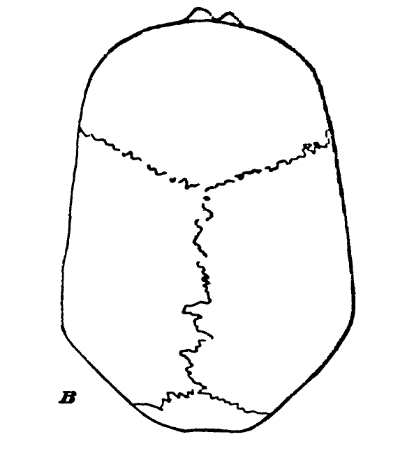 The first specimen, examined from a vertical view, shows something of the typical character as figured in A, and when viewed posteriorly there is noticed a flattening of the parietal walls with an elongated vertex as shown in D; while a second specimen, represented by B, shows none of the foregoing characteristics, the form being elongated and the parietal walls so far overhanging as to conceal the zygomatic arches in the vertical view, so that if lines be drawn as previously mentioned, instead of forming a triangle they may, like the asymptotes of a parabola, be extended to infinity and never meet.