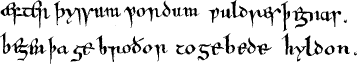 geben, woraus geschlossen wird, dass das nur siebenhundert 34 und vier und sechszig verse enthaltende werk nicht vollständig sei. Wright theilt diese acrostische einleitung aus einem im brittischen Museum aufbewahrten alten manuscripte mit. Sie möge ihrer sonderbarkeit wegen und als älteste probe lateinischer dichtung der Angelsachsen hier eine stelle finden: