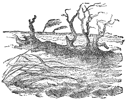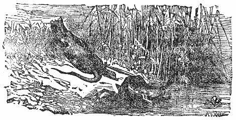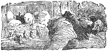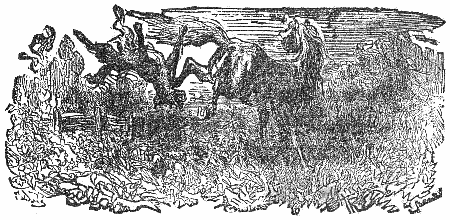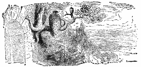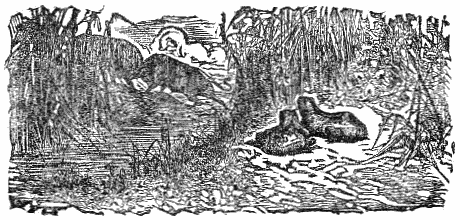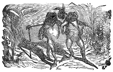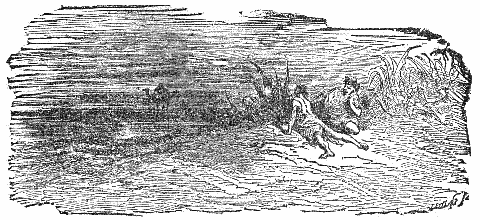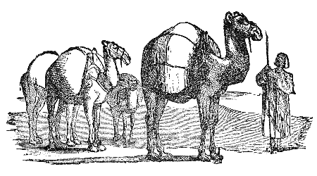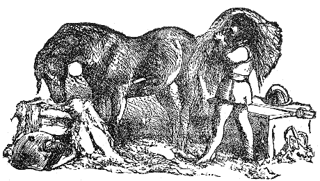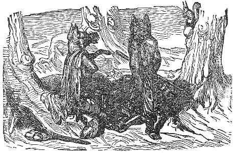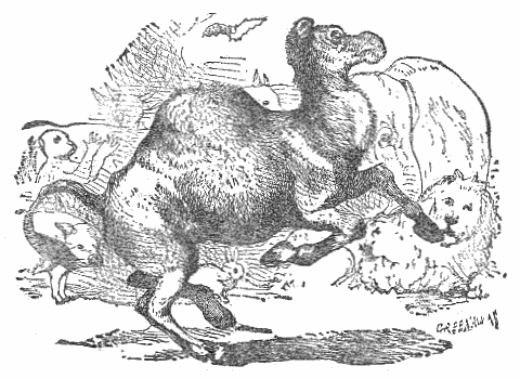 Two Travelers on a desert saw a Camel in the distance, and were greatly frightened at his huge appearance, thinking it to be some huge monster. While they hid behind some low shrubs, the animal came nearer, and they discovered that it was only a harmless Camel which had excited their fears.
