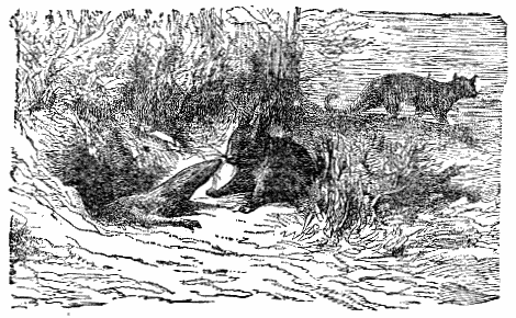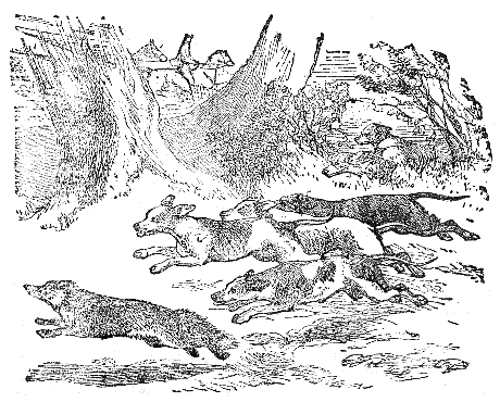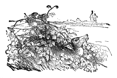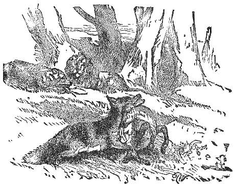 A greedy Hunter one day shot a fine Deer, and ere he could dress it, a pretty Fawn came that way, and an arrow brought it to the ground. A Boar now chanced to be passing, and the Hunter wounded it so that it lay upon the ground as if dead. Not satisfied with this game, he must needs pursue a Partridge that came fluttering near, and while he was doing so the wounded Boar regained enough strength to spring upon him and kill him. A Wolf came that way, and seeing the four dead bodies, said: "Here is food for a month; but I will save the best, and be content to-day with the bow-string." But when he seized the string it loosened the fixed arrow, which shot him through the heart.