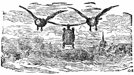 A Tortoise, becoming tired of her humble home, resolved to visit foreign lands, but she did not know which way to go. She repaired to two Ducks to show her the road, and they told her that the best way to travel was through the air. On her imploring their help, they made her grasp a stick with her mouth, and so they bore her aloft. As they flew along, the gaping people beneath shouted at sight of the spectacle. The vain Tortoise mistook their shouts for applause. "I am surely a queen," said she. But, alas! as she opened her mouth to speak she lost her hold of the stick, and, falling to the ground, was dashed to pieces.