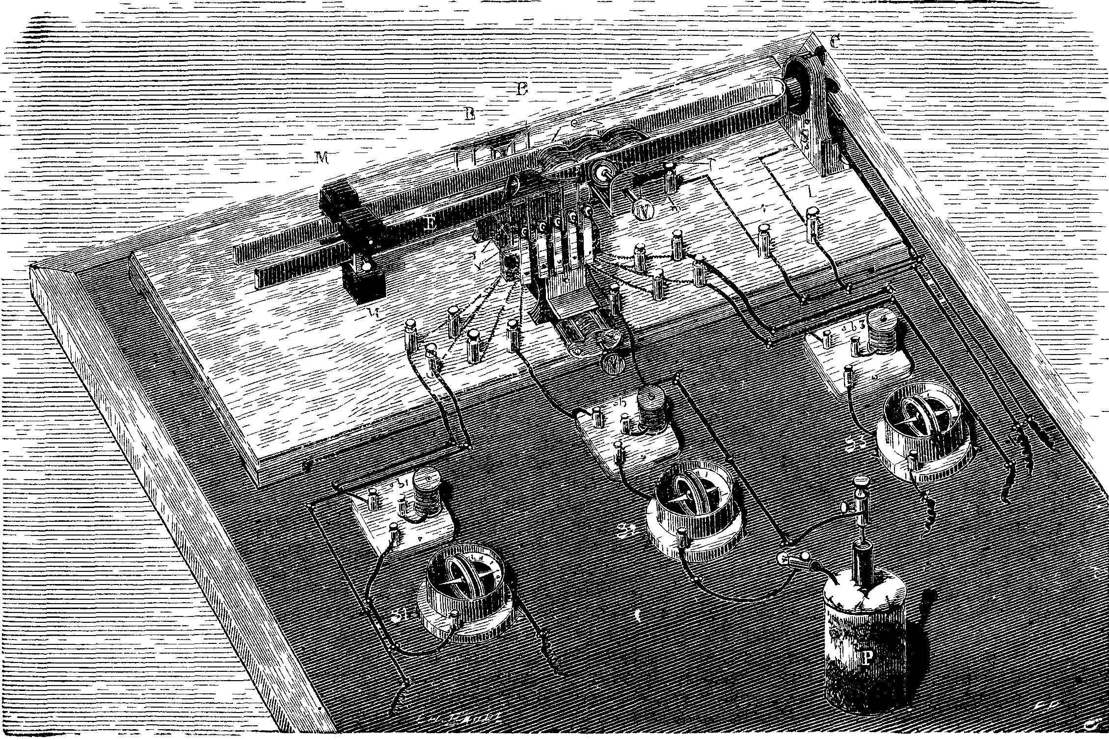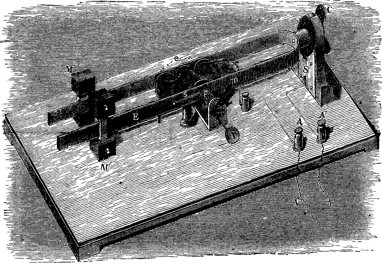 There will be seen in the figure the electro-magnet which keeps up the vibration. This is formed of three simple electro-magnets, whose bobbins have a resistance of no more than 10 ohms, and which are united in series. The interrupting plate, P, against which the style, s, rests at each vibration, is capable of a forward movement, or one of recoil, by the aid of a screw, V, and of an eccentric movement which is produced by a small handle, m, and during which its plane remains invariable. This arrangement permits the point of contact of the style and plate to be varied without changing the precision with which the contact takes place, and all the points of the plate to be slowly used in succession before replacing it. The motion is produced by means of a relatively weak pile, whose poles are connected to the terminals, A and A'. Three Callaud elements of triple surface, renewed one after the other every month at the most, are sufficient to keep up the vibrations continuously, day and night, without interruption, and that too even when the instrument is employed in producing a small mechanical power, as we shall see further on.