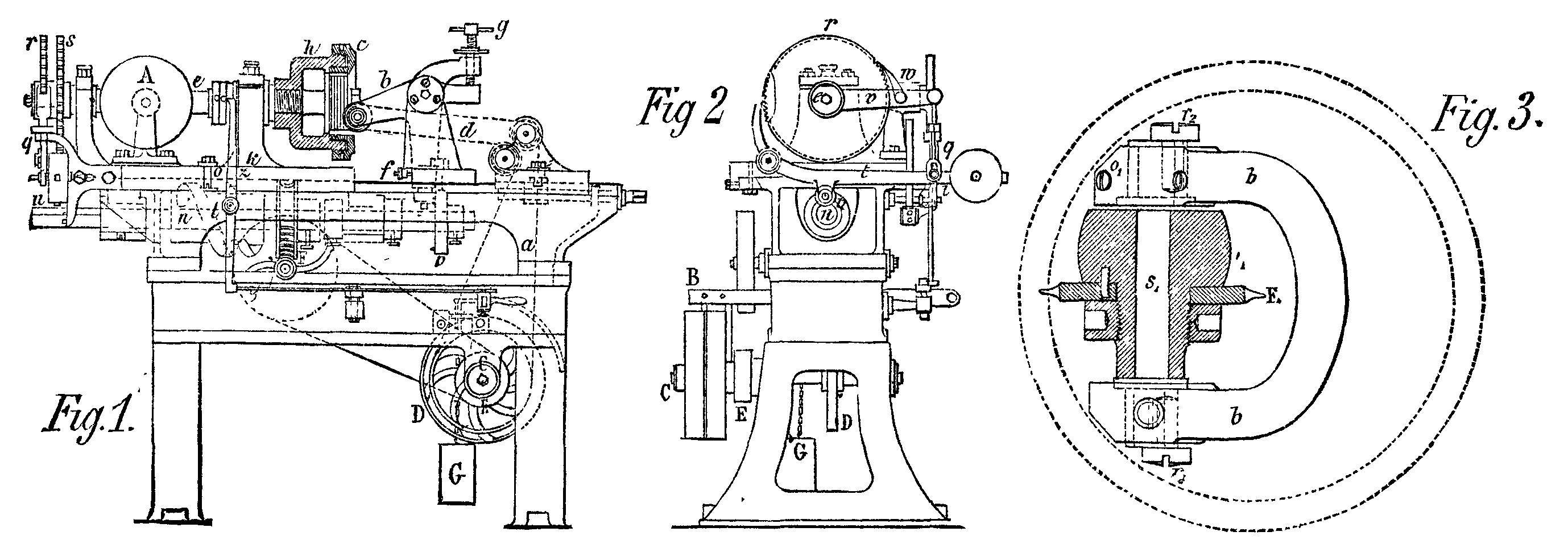 One hollow is cut during each forward travel of the carriage; and, when such travel is finished, a cam-disk, p, placed on the shaft, n, lifts the tool-carrier, b, and thus draws the cutting-tool out of the hollow cut by it, so that the carriage cam can then move back without restraint. In the interim, the sleeve, h, which supports the wheel, revolves one tooth through the following arrangement: On the axis, e, of this sleeve there are two ratchet-wheels, r and s, the number of whose teeth is equal to that of the teeth to be cut in the wheel. The wheel, r, produces the rotation of the sleeve, h, and the wheel, s, keeps the shaft stationary during the operation. The two wheels are set in motion by a lever, t, or by its click, this lever being raised at the desired moment on the free extremity of the driving shaft, n, by a wedge, u. The short arm of the lever, t, engages, through its point of appropriate shape, with the teeth of the wheel, s, so as to keep this latter stationary while the tool is cutting out the interspace between the teeth. When the lever, t, is raised, this point is at first disengaged from the wheel, s; and the raising of the lever being prolonged, the button, i, places itself against the upper curve of the slot in the lever, q, and raises that likewise. q is connected with the lever, v, which revolves about the axis, e, and v carries the click, w, so that when the lever, v, is raised, the wheel, r, turns forward by one tooth. When the lever, t, is lowered, as the wedge, u, turns more, its click holds the wheel, s, stationary. This series of operations is repeated until the last interspace between the teeth has been cut, when the machine stops automatically as follows: A cam of the disk, A, which receives from the shaft, n, through cone-wheels, a motion corresponding to that of the wheels, r and s, abuts against the two-armed lever, z, and this latter then disengages the rod, y, so that the weight, G, can move the fork, B, in such a way that the belt shall pass from the fast to the loose pulley.