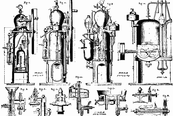 Each of the generators communicates by special pipes, a, with a single safety vessel, V, that operates the same as in the preceding apparatus. The agitator, Q, is of bronze, and is curved as shown in Fig. 11.