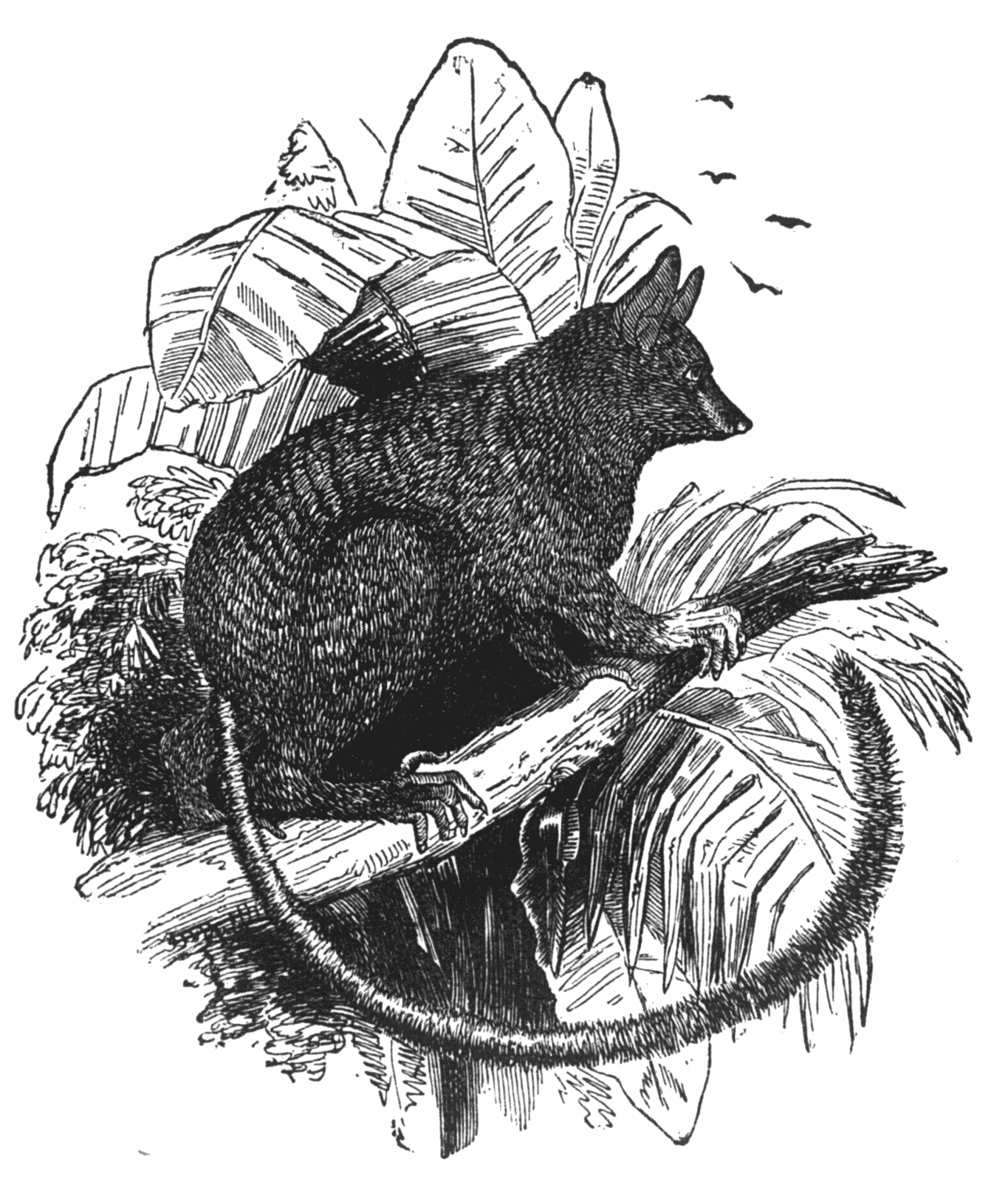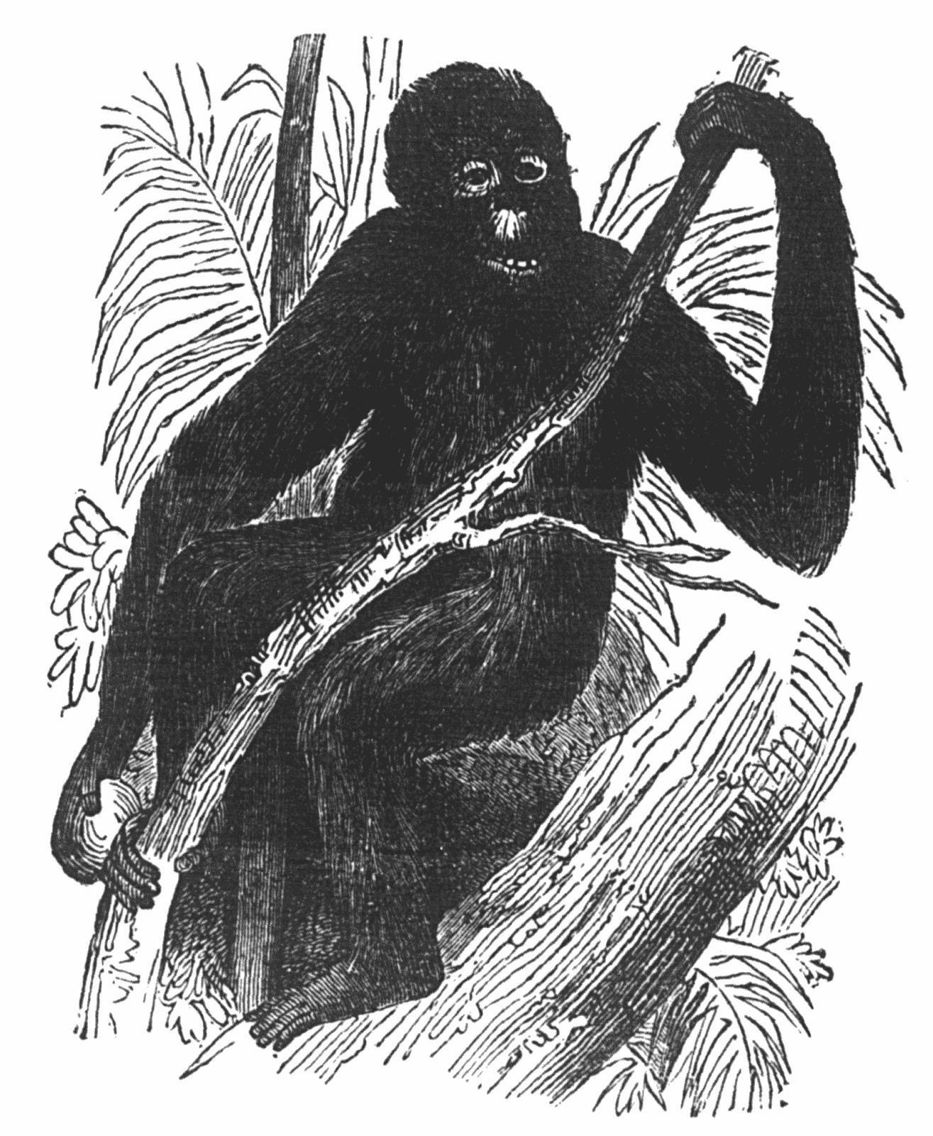 In Africa the orang-outang is a very formidable animal, and does not hesitate to attack men, when alone and without arms, in which cases he always proves himself the victor. He sleeps under trees, and builds himself a hut, which serves to protect him against the sun and the rains of the tropical climates. When the negroes make a fire in the woods, this animal comes near and warms himself by the blaze. However, he has not skill enough to keep the flame alive by feeding it with fuel. They even attack the elephant, which they beat with their clubs, and oblige to leave that part of the forest which they claim as their own. When one of these animals dies, the rest cover the body with a quantity of leaves and branches. They sometimes show mercy to the human species. A negro boy, it is said, that was taken by one of them and carried into the woods, continued there a whole year, without receiving any injury. It is said, indeed, that they often attempt to surprise the negroes as they go into the woods, and sometimes keep them against their will, for the pleasure of their company, feeding them very plentifully all the time. In respect to this latter statement, however, I confess myself a little skeptical. There have been a great many well-told stories about men of the woods, which have proved to be altogether fabulous, when the true state of the case has become known.