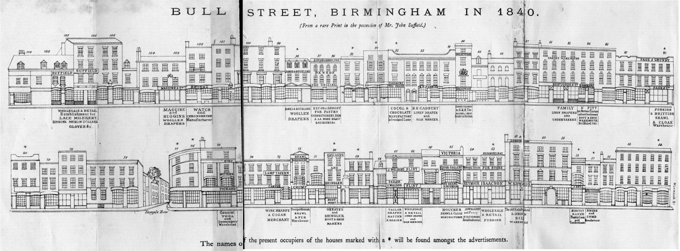 Bull Street was then the principal street in Birmingham for retail business, and it contained some very excellent shops. Most of the then existing names have disappeared, but a few remain. Mr. Suffield, to whose courtesy I am indebted for the loan of the rare print from which the frontispiece to this little book is copied, then occupied the premises near the bottom of the street, which he still retains. Mr. Adkins, the druggist, carried on the business established almost a century ago. He is now the oldest inhabitant of Bull Street, having been born in the house he still occupies before the commencement of the present century. Mr. Gargory—still hale, vigorous, and hearty, although rapidly approaching his eightieth year—then tenanted the shop next below Mr. Keirle, the fishmonger. His present shop and that of Mr. Harris, the dyer, occupy the site of the then Quakers' Meeting House, which was a long, barn-like building, standing lengthwise to the street, and not having a window on that side to break the dreary expanse of brickwork. Mr. Benson was in those days as celebrated for beef and civility as he is now. Mr. Page had just opened the shawl shop still carried on by his widow. Near the Coach Yard was the shop of Mr. Hudson, the bookseller, whose son still carries on the business established by his father in 1821. In 1837, Mr. Hudson, Sen., was the publisher of a very well conducted liberal paper called The Philanthropist. The paper only existed some four or five years. It deserved a better fate. Next door to Mr. Hudson's was the shop of the father of the present Messrs. Southall. All these places have been materially altered, but the wine and spirit stores of Mrs. Peters, at the corner of Temple Row, are to-day, I think, exactly what they were forty years ago. The Brothers Cadbury—a name now celebrated all over the world—were then, as will be seen by reference to the frontispiece, shopkeepers in Bull Street, the one as a silk mercer, the other as a tea dealer. The latter commenced in Crooked Lane the manufacture of cocoa, in which business the name is still eminent. The Borough Bank at that time occupied the premises nearly opposite Union Passage, which are now used by Messrs. Smith as a carpet shop. In all other respects—except where the houses near the bottom are set back, and the widening of Temple Row—the street is little altered, except that nearly every shop has been newly fronted.