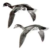 Glossy slate-blue plumage enlivened by white stripes and spots give the adult male harlequin a striking appearance. The female resembles a small female scoter. At a distance, both sexes look black. Flight is swift, with abrupt turns. Flocks are small and compact. Ranges both coasts, north from New Jersey and San Francisco. Uncommon.